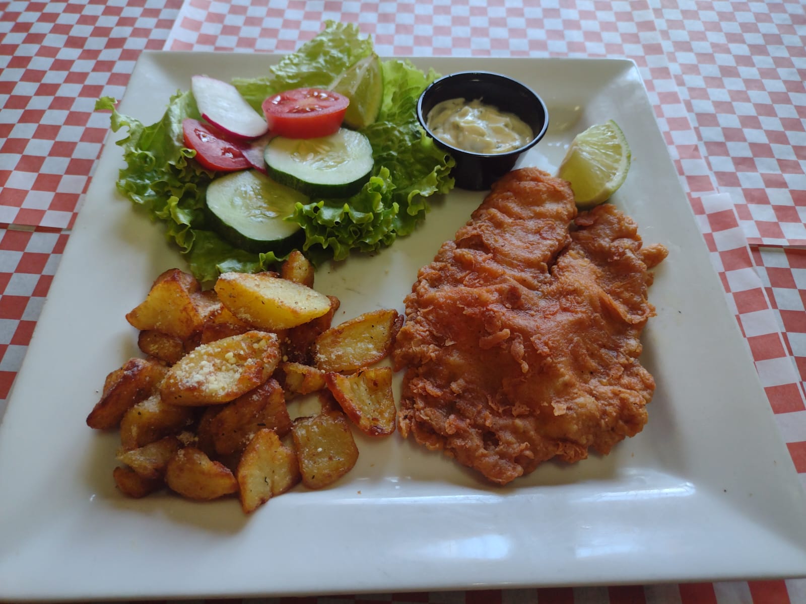 Lonja empanizada con salsa tártara y papas salteadas a la parmesana.. $ 4.95