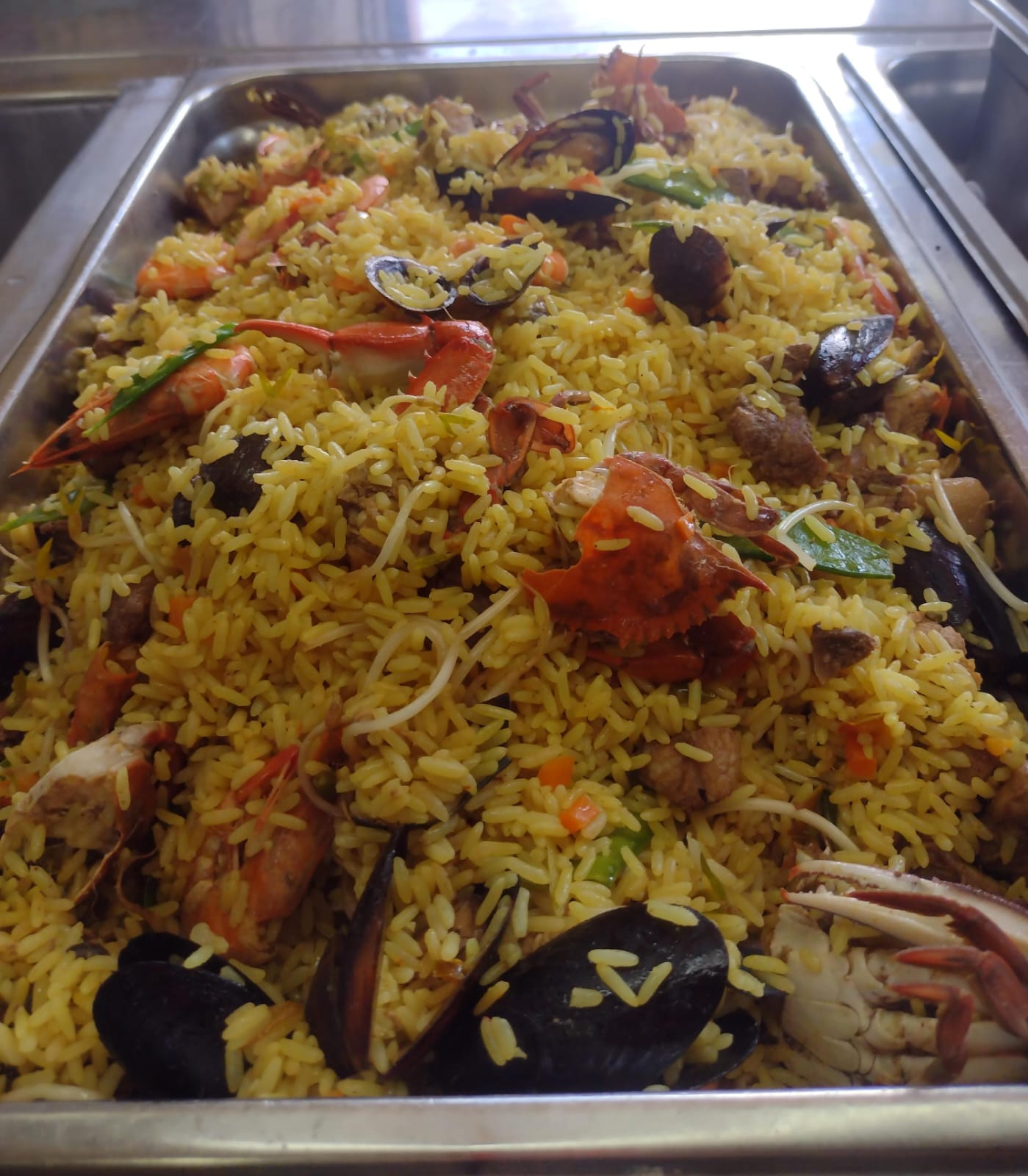 Paella con mariscos, incluye 2 panes con ajo $ 5.00